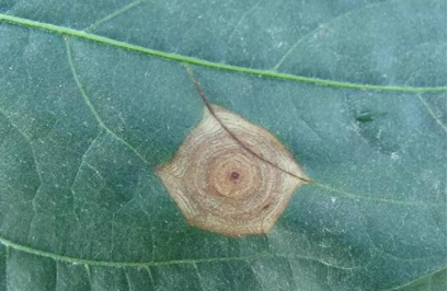 1.2 梭形病斑症状 该症状病斑发病初期,主要在叶片中间主叶脉边上形成深褐色小圆点,中央微凹陷,随病斑发展,沿着叶片主叶脉往两边侵染,形成梭形病斑,可侵染叶脉,导致叶脉干枯,病健交界明显,具有明显的轮纹,病斑背面颜色鲜艳,呈红褐色,有灰褐色霉层。