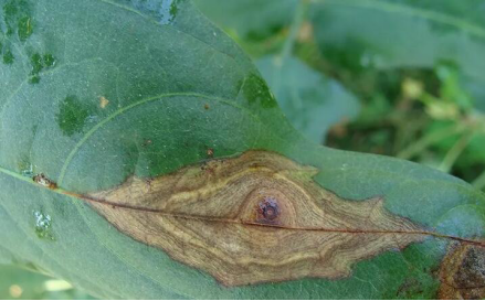 1 豇豆轮纹叶斑病的症状 1.1 圆形病斑症状 发病初期,病斑为褐色小圆点,不受叶脉限制,随着病斑发展,逐渐形成轮纹状圆形斑,微凹陷,病健交界明显;病斑背面颜色较深,受侵染的叶脉呈红褐色,也具有明显的轮纹。